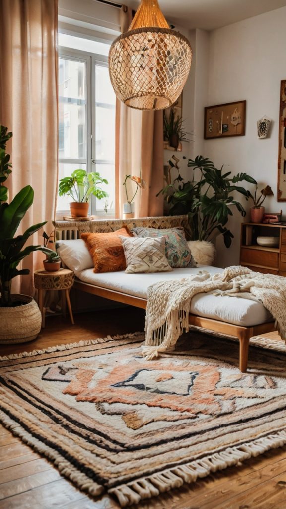 Layer different textures like macrame wall hangings, woven baskets, and vintage rugs. Mix patterns fearlessly but stick to a cohesive color story. I usually pick three main colors and make sure everything ties back to those.