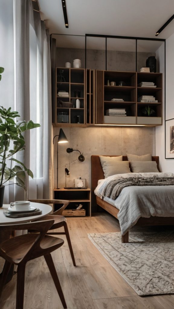 Create visual separation without walls. A bookshelf, curtain, or even just a rug can define your sleeping area from your living space. Going vertical with storage keeps the floor clear—wall-mounted everything is your friend.