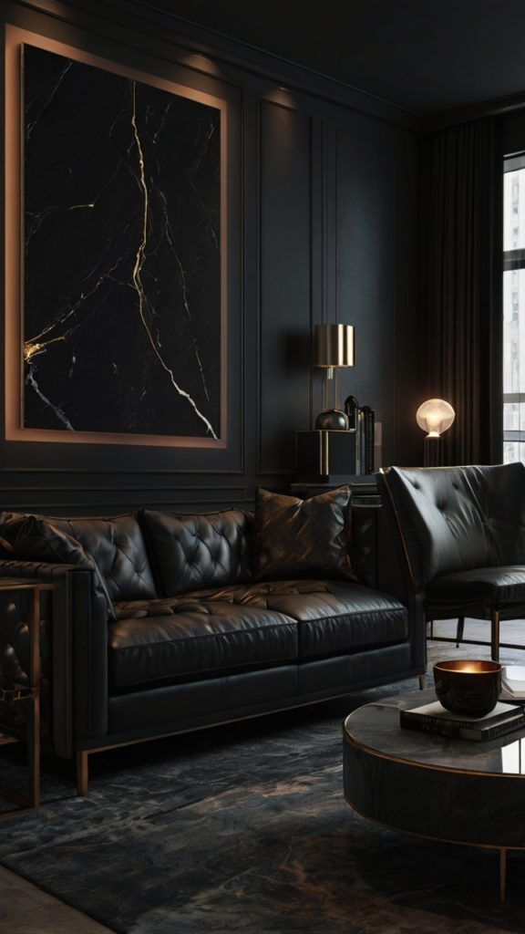 Start with varying shades of grey on walls and large furniture pieces. Pure black should be an accent, not the main event. Add visual interest through different textures: matte black metal, glossy surfaces, rough concrete, smooth leather.