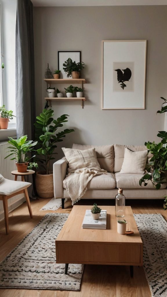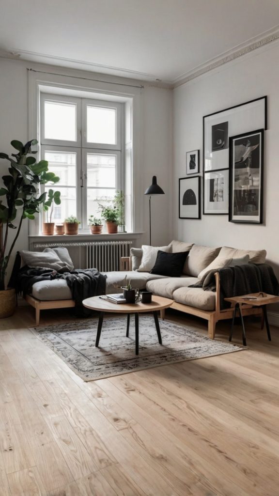 The foundation? White walls and light wood floors (or light wood-look vinyl if you’re renting). Furniture should be simple with clean lines—think IKEA but better quality. The magic happens in the details: a sheepskin throw over a chair, one perfect plant in a ceramic pot, maybe a single piece of abstract art.