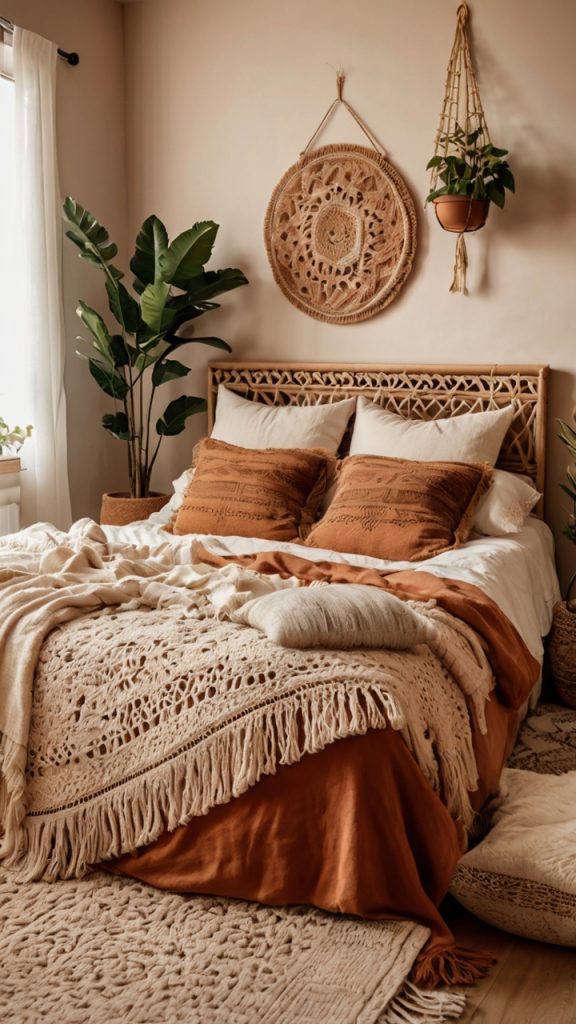 Want to nail the boho look? Start with layered textiles – think multiple throw pillows, a mix of blankets, and maybe a tapestry or two. I personally love combining different patterns and textures because life’s too short for matching everything perfectly. Macramé wall hangings are basically mandatory (FYI, they’re easier to make than you’d think), and don’t forget those essential elements: