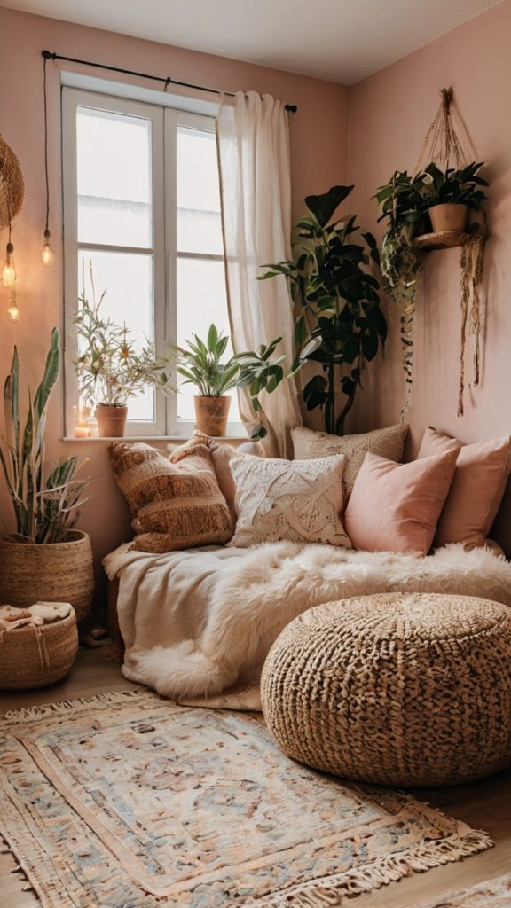 Sometimes you don’t need to transform your entire bedroom – just one perfect corner can become your personal retreat. A soft feminine bohemian corner combines comfort with style, creating a dedicated space for reading, meditating, or just escaping.
