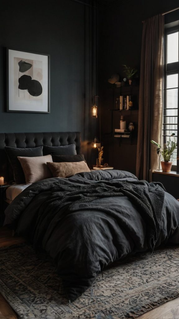 Want to turn your bedroom into a personal gallery? Black walls provide the perfect backdrop for showcasing art, whether it’s your own creation or pieces you’ve collected.