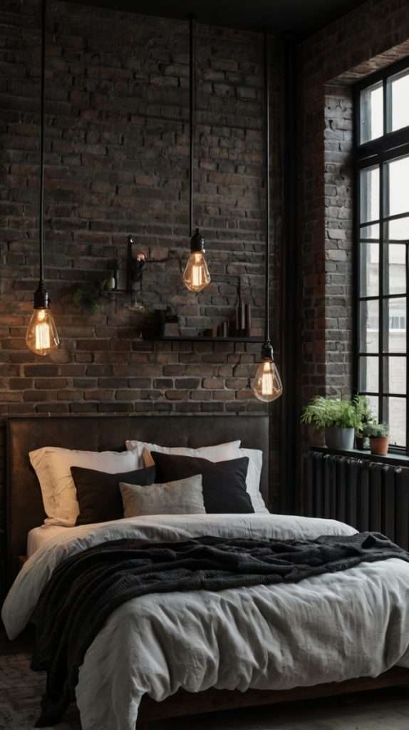 My brother converted his loft bedroom to industrial style last year, complete with a black brick accent wall. The exposed pipes, metal bed frame, and concrete elements look absolutely killer against it. Even better? He did most of it himself for under $500.
