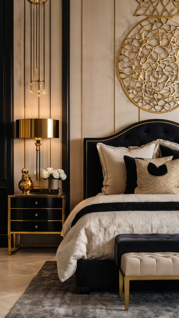 Black and Beige Bedroom with Gold Accents