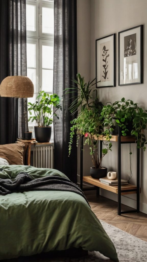 Start with a low-profile black platform bed. Add one piece of green – maybe a single oversized plant or a geometric green art piece. Keep surfaces clear except for essentials. The result? A space that feels intentional and calming, not sparse and cold.