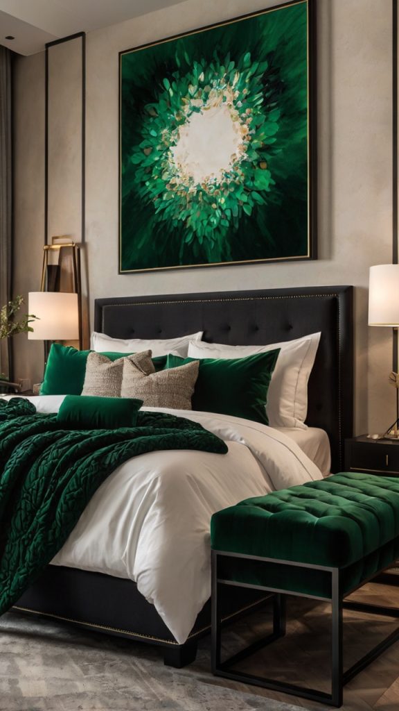 Last but definitely not least, emerald bedding paired with black wall art creates this jewel box effect that’s absolutely stunning. The bedding becomes the star while the black art provides sophisticated contrast.