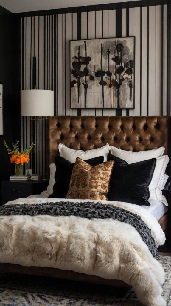 Pick a corner and anchor it with a black leather reading chair. Add a white faux fur throw, a small black side table, and a sleek floor lamp. This becomes your personal retreat within your retreat.