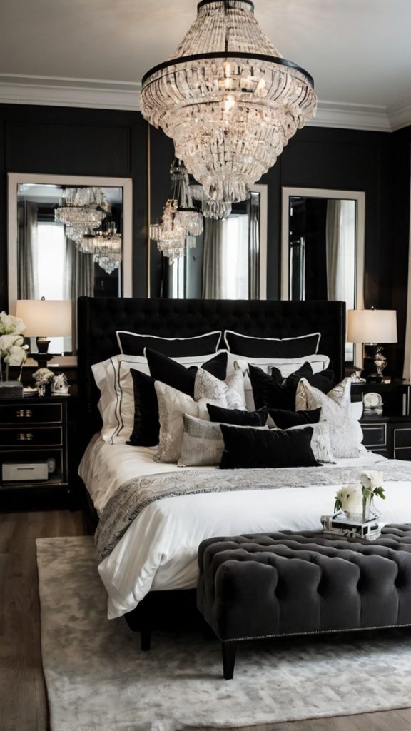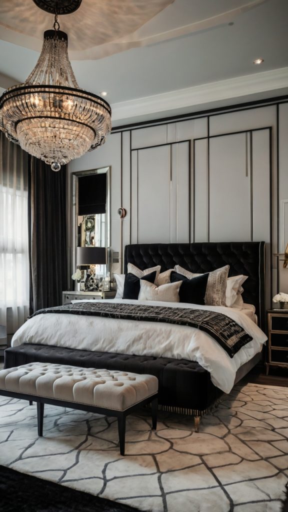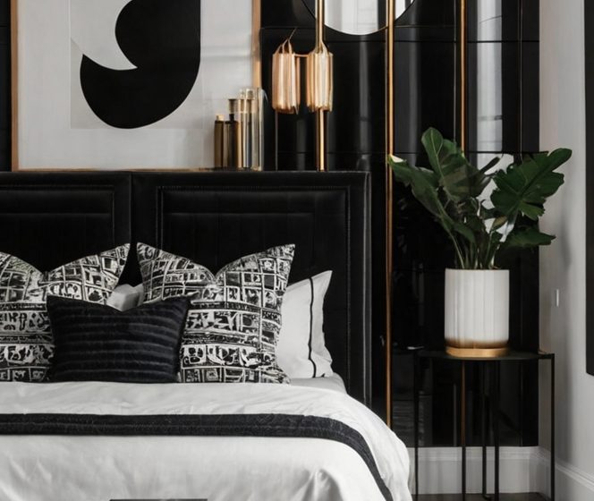 Choose a tufted white headboard and pair it with black nightstands with gold hardware. Layer your bed with high-thread-count white sheets, a black duvet, and more pillows than any human actually needs. The secret sauce? Symmetry. Everything should be perfectly balanced – matching lamps, matching art pieces, matching everything.