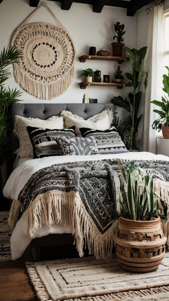 Start with a white base and layer in black tribal patterns through textiles. Hang a black macramé wall hanging (they exist, I promise!) and throw in some white pampas grass. The trick is mixing textures like crazy – think chunky knit blankets, woven baskets, and tasseled pillows all in your monochrome palette.