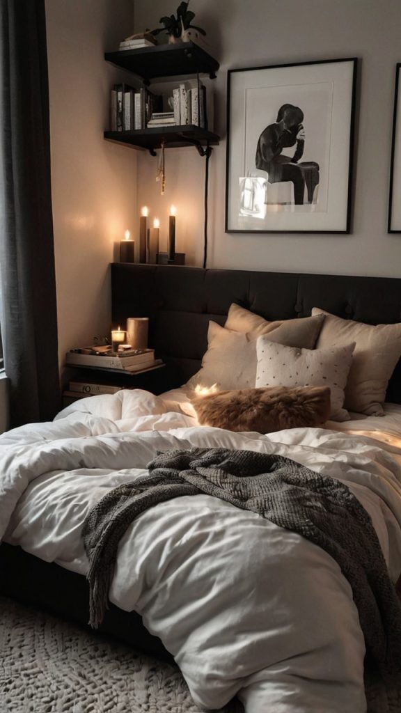 Want to add personality without clutter? Mount a single large black and white photograph above your bed. I’ve got this massive print of foggy mountains that totally transforms my space without adding any physical bulk.