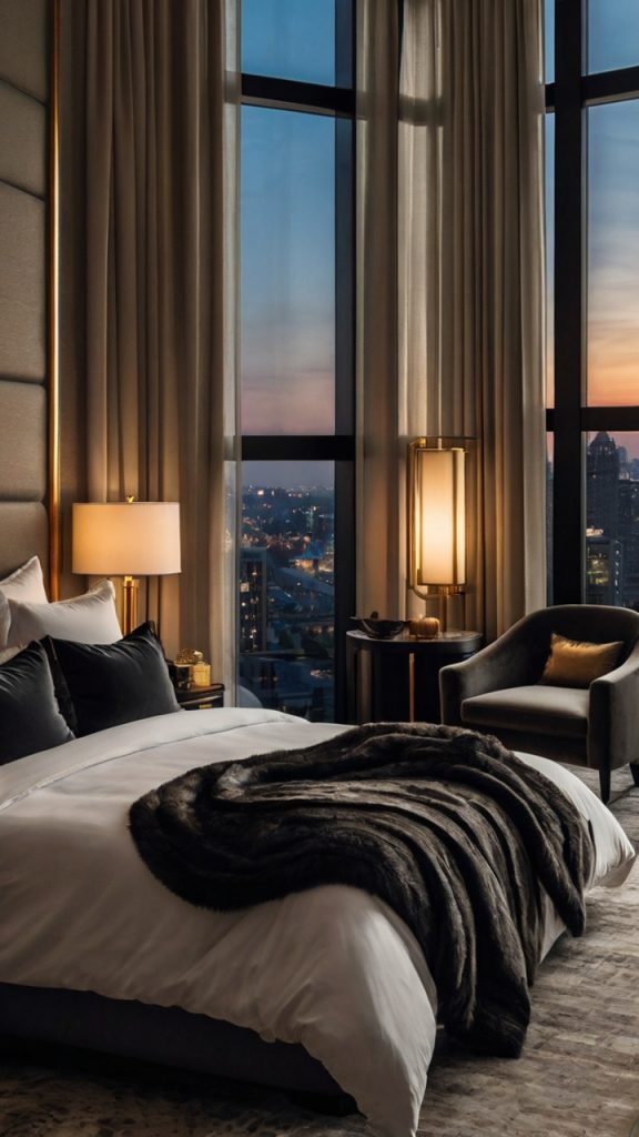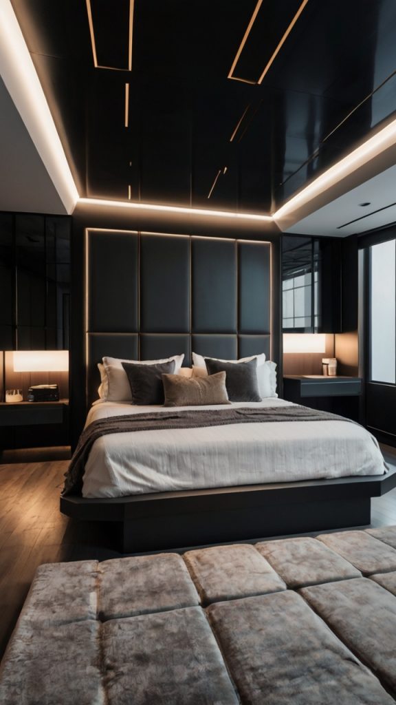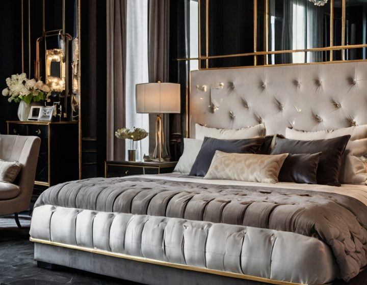 Start with a statement bed – maybe a black velvet upholstered frame or a white leather platform bed with LED underlighting. Add silk curtains, marble bedside tables, and artwork that costs more than your monthly rent (or looks like it does).