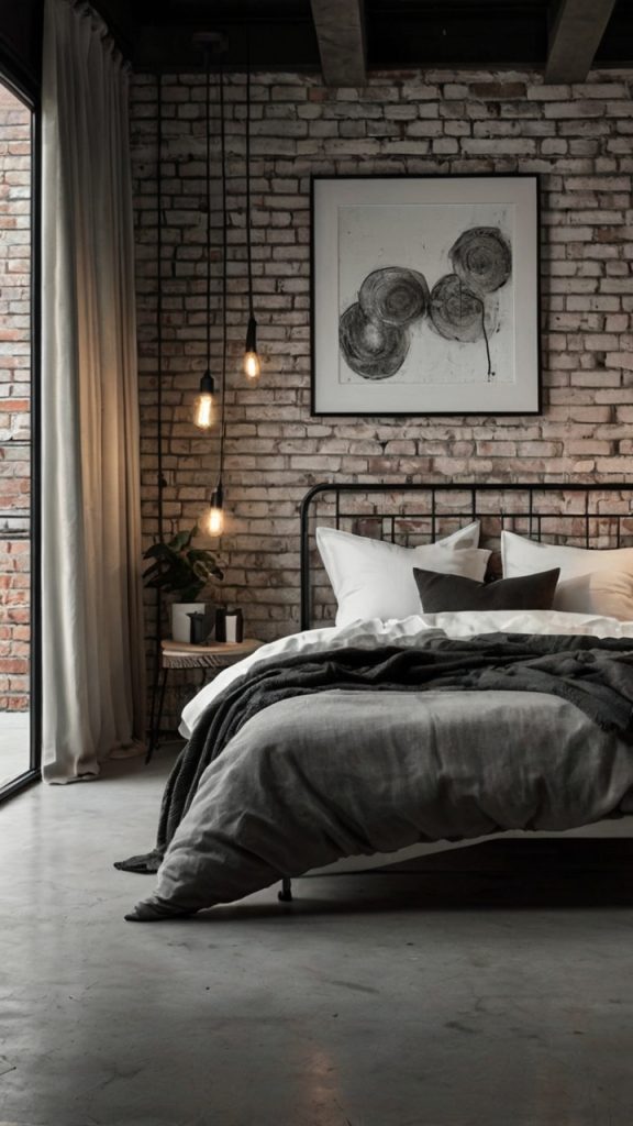 Expose those brick walls and paint them white, or leave them natural and work around them. Add black metal furniture, Edison bulb lighting, and concrete elements. The contrast between rough textures and the clean color scheme creates incredible visual interest.