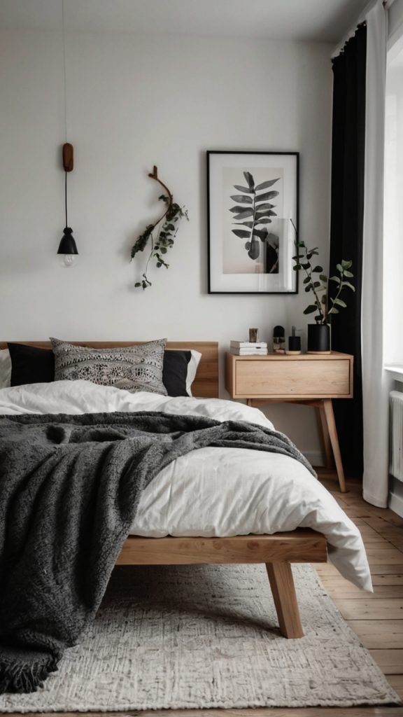 Paint your walls white (shocking, I know) and bring in black through your furniture and accents. Add warmth with light wood elements – yes, wood counts as neutral in this context. Layer in tons of soft textiles because Scandinavian bedrooms should feel like a warm hug.