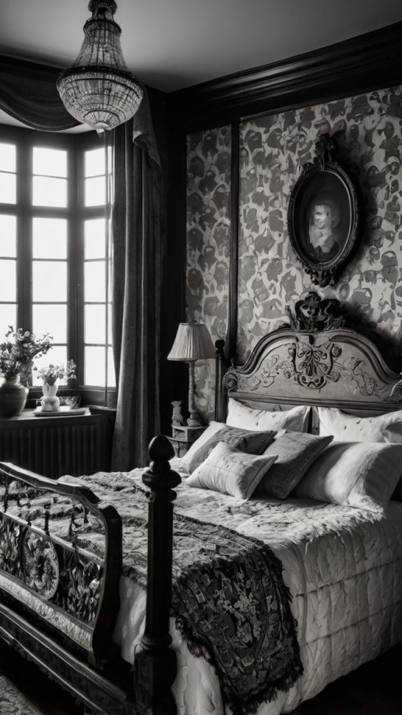 Hunt for a vintage iron bed frame (paint it black if needed) and pair it with crisp white linens. Add black and white photography from different eras, vintage typography prints, and maybe an old-school rotary phone if you’re feeling extra.