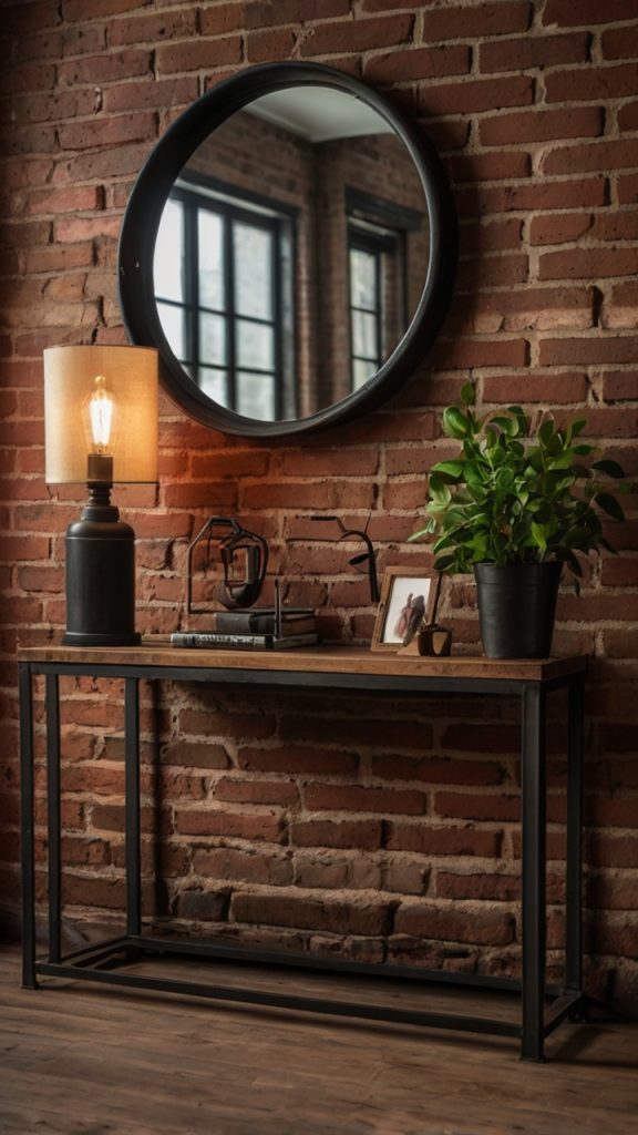 Pure industrial can feel cold, so add warm elements. A leather tray, wooden picture frames, or even a small vintage rug underneath prevents the space from feeling too harsh.