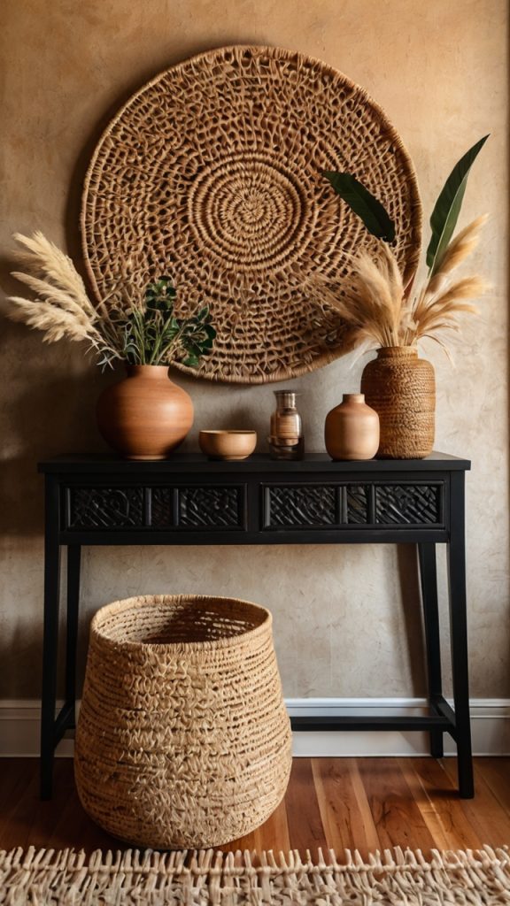 Start with natural textures – macramé wall hangings, woven baskets, maybe a small Turkish rug underneath. These soft elements contrast beautifully with the hard black surface.