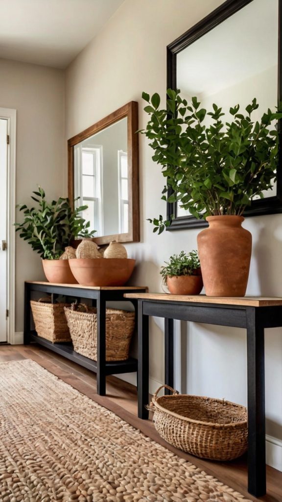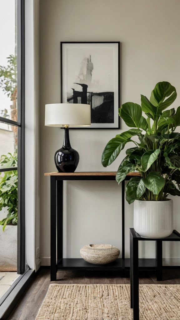 Speaking of plants, let’s talk about creating a mini indoor garden on your black entryway table. Greenery against black creates this lush, sophisticated look that brings life to your entrance.