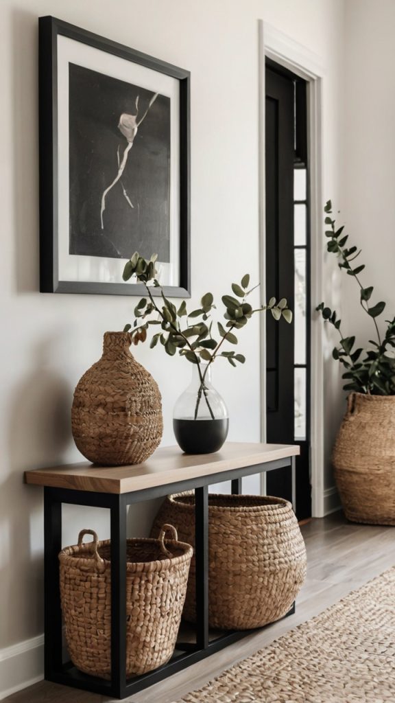 Layer in natural wood tones through picture frames or a wooden bowl. Add woven baskets underneath for storage that doubles as decor. The contrast between refined black and raw materials creates visual interest that never gets old.