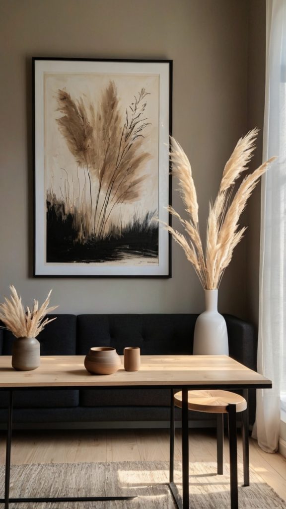 Throw in some dried wheat stalks or cotton stems in a simple glass vase. These natural elements soften the black while maintaining that rustic authenticity. Plus, dried arrangements mean zero maintenance – winning!
