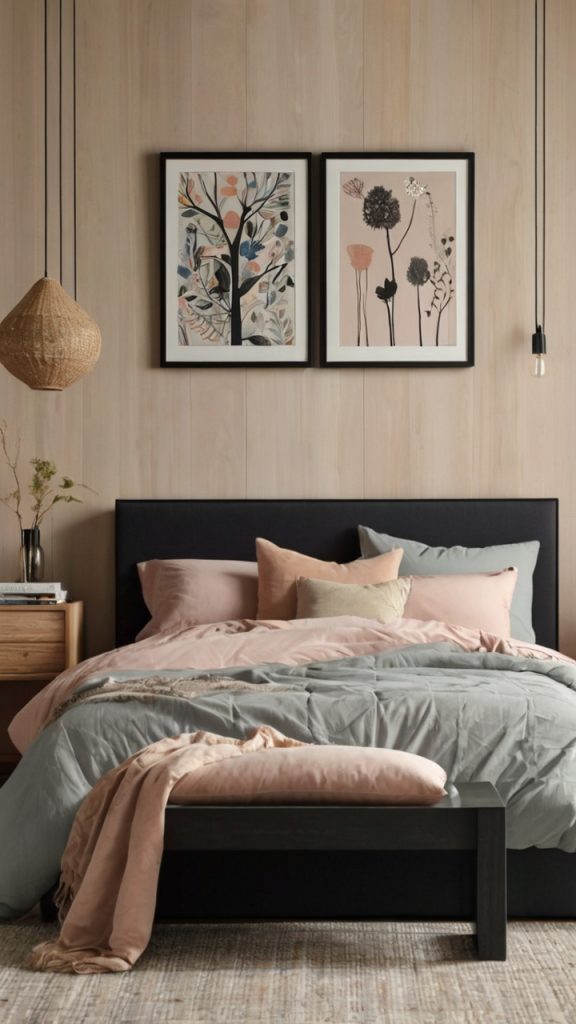 Think baby pink sheets against a black leather headboard, or mint green pillows on a black upholstered bed. The contrast makes the pastels pop without feeling too sweet or juvenile. It’s basically the bedroom equivalent of adding edge to a sundress with leather boots.