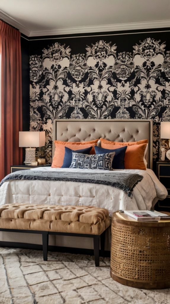 Want drama? Combine a black headboard with patterned wallpaper. This combo creates instant visual interest that makes your bedroom feel designed, not decorated.