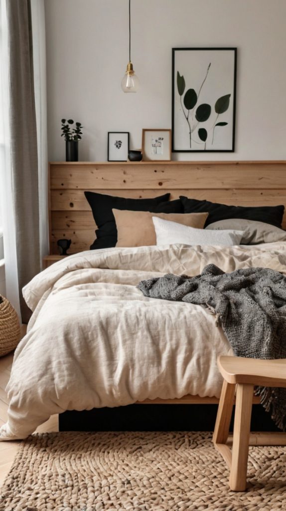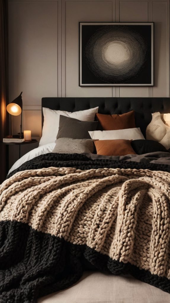 Let’s end with my personal favorite – loading up on cozy textures with a black headboard as your base. This approach turns your bedroom into the ultimate comfort zone.