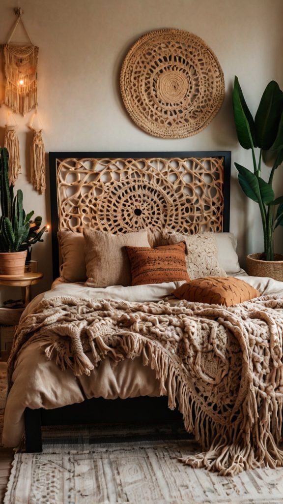 Picture this: a black rattan or carved wood headboard surrounded by macramé wall hangings, layered textiles, and enough plants to start your own jungle. The black grounds all that boho chaos in the best possible way. It’s like wearing combat boots with a flowy dress – unexpected but totally works.