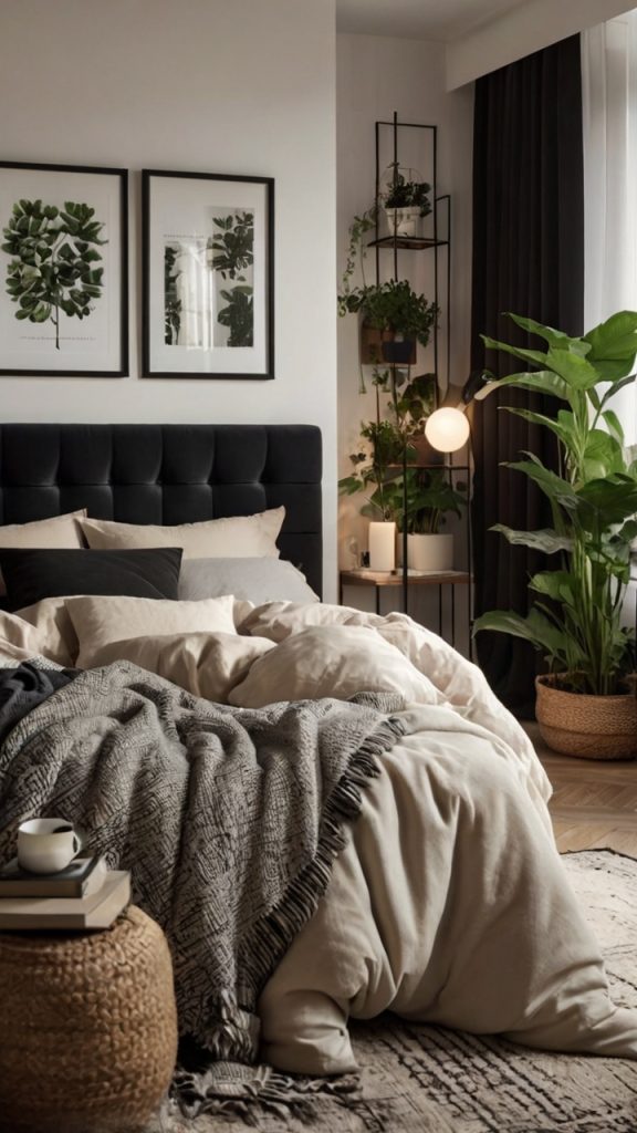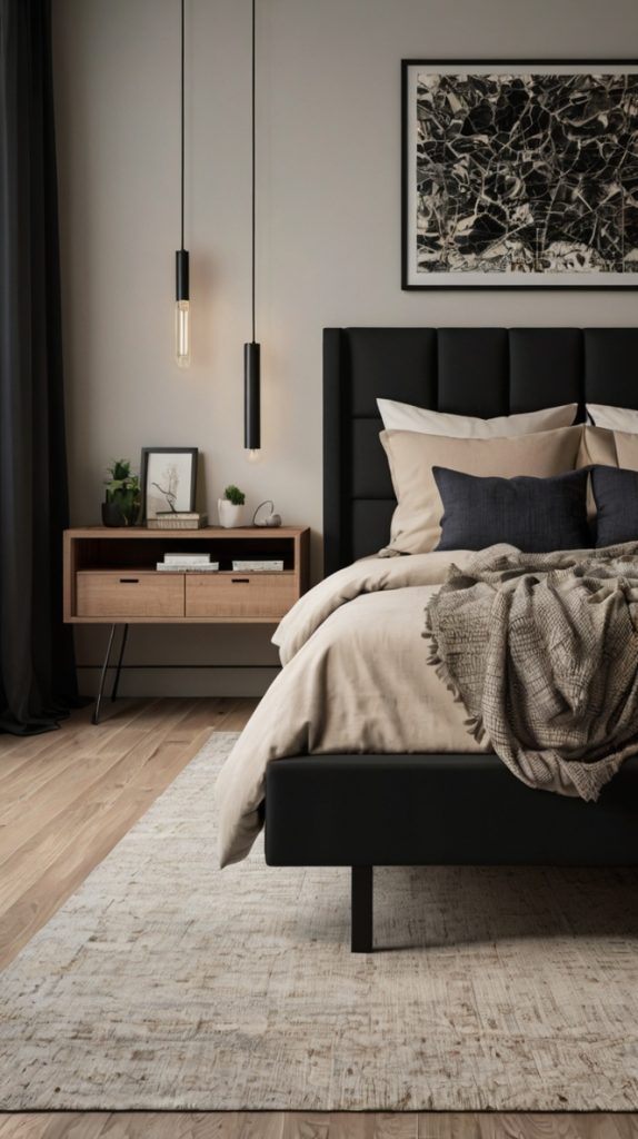 Here’s the thing: everyone thinks black makes rooms feel smaller. But when you use it as a focal point rather than everywhere, it actually creates depth. A black headboard against a light wall makes the wall appear to recede, giving you the illusion of more space. Mind blown, right?