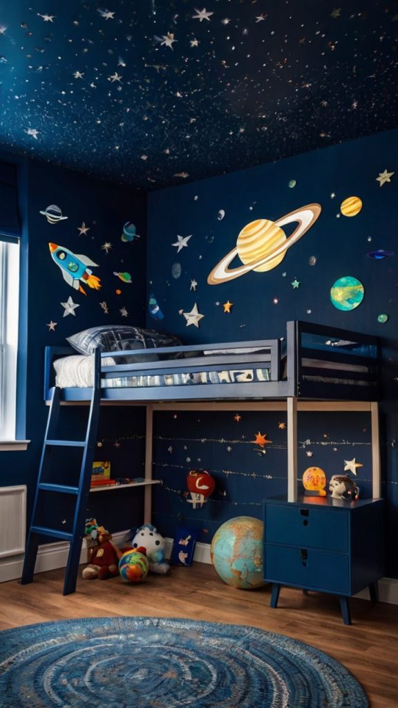 Who says you need NASA’s budget to create an out-of-this-world bedroom? A space-themed room captures that sense of adventure every boy seems hardwired with from birth. Start with a dark navy or black accent wall – it instantly creates that deep space vibe without making the entire room feel like a cave.