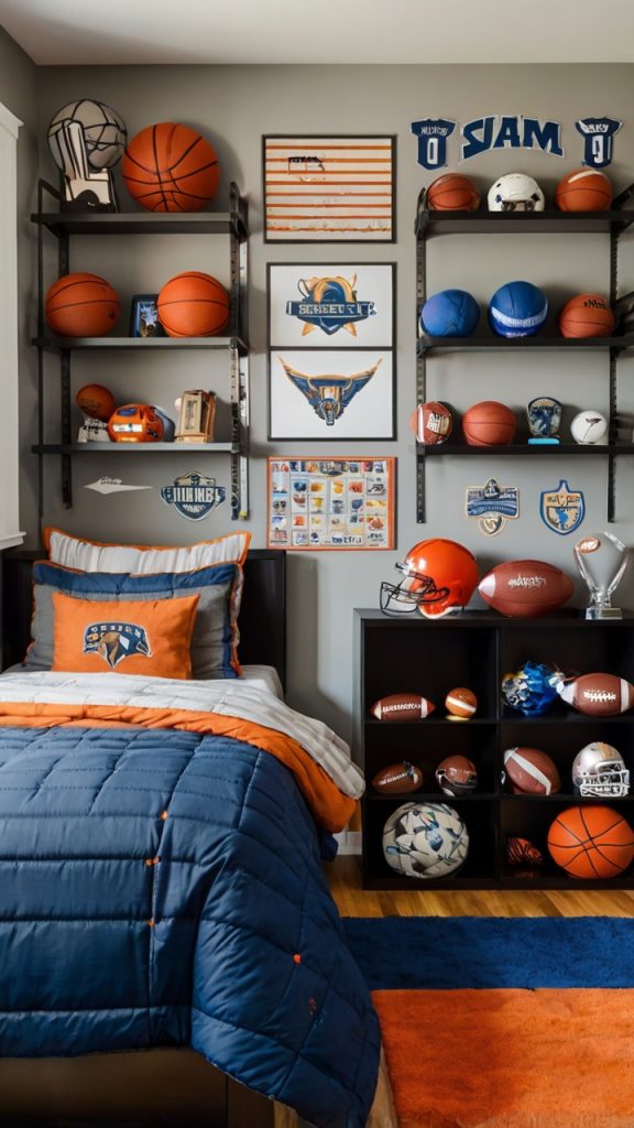 Mount actual equipment on walls as art – vintage baseball gloves, hockey sticks, or skateboard decks look incredible and cost way less than traditional artwork. Display jerseys in shadow boxes instead of letting them collect dust in closets. Paint one wall to look like a basketball court or soccer field.