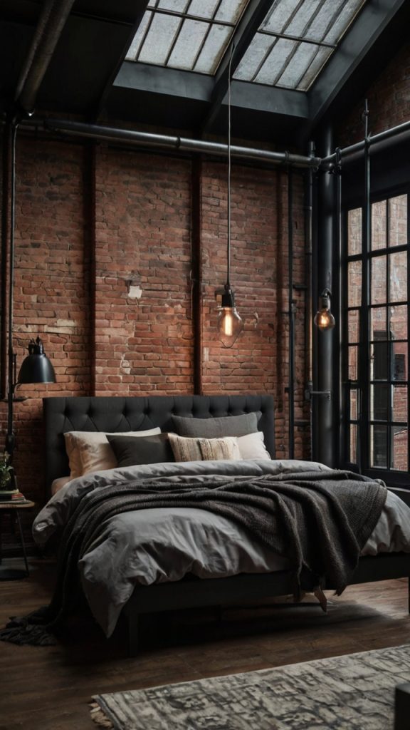Exposed bulb string lights, metal pipe shelving, and distressed wood furniture set the tone. A metal bed frame and concrete-looking walls (achieved with special paint techniques) complete the look. This style works especially well in smaller rooms since it embraces the space rather than trying to hide it.