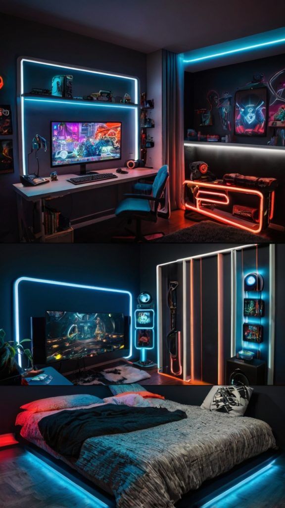Position the gaming area strategically – not directly facing the bed (trust me on this one). Use LED strips behind monitors for ambient lighting that reduces eye strain. Cable management becomes your best friend here; those spiral cable wraps will save your sanity.
