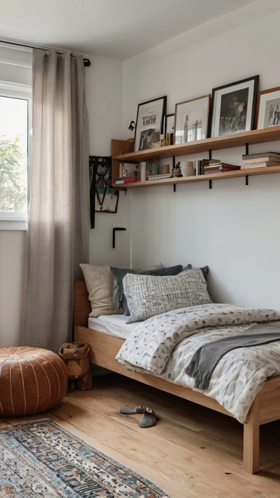 Start with a platform bed with built-in storage drawers. Add floating shelves instead of bulky bookcases. Choose a color palette of whites, grays, and one accent color – maybe a bold orange or electric blue. The trick here is keeping surfaces clear and having a designated spot for everything.