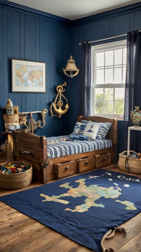 Start with a ship’s wheel on the wall and rope details wherever possible. A wooden chest at the foot of the bed stores toys while doubling as pirate treasure storage. Navy blues, weathered woods, and brass accents create that authentic maritime feel.