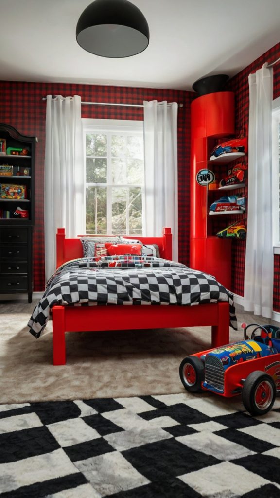 A tire ottoman or shelving unit made from car parts adds authentic touches. Display model cars on floating shelves arranged like a racetrack. Use racing stripes on one wall or checkered patterns as accents.