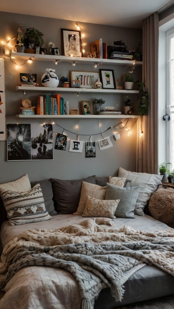 Ditch the traditional bed setup for a daybed or futon that doubles as seating. Add floor cushions, a small fridge (if you’re feeling generous), and good speakers. String lights or neon signs create ambiance without being too bright.