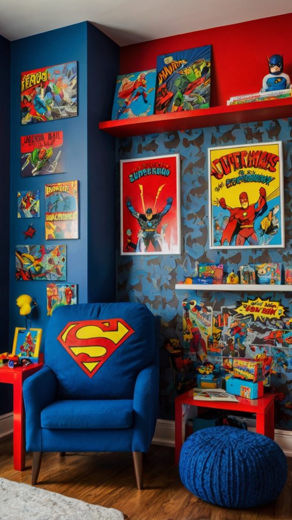 Create a feature wall with removable superhero decals or a city skyline mural. Add vintage comic book covers in frames – they’re basically pop art at this point. The bedding can be superhero-themed, but keep other elements more neutral so the room can evolve.