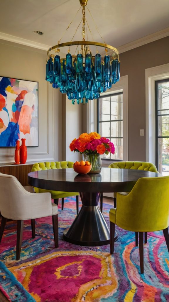 Fair warning: colorful chandeliers demand to be the star of the show. Keep the rest of your dining room relatively neutral, or you risk creating visual chaos. Think of it as giving your chandelier the stage it deserves.