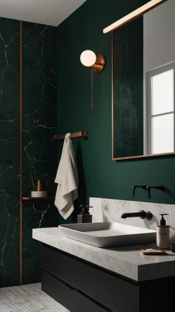 Use dark green on just one or two walls if you’re nervous about going all-in. The accent wall approach works brilliantly in small bathrooms. Other smart moves include:
