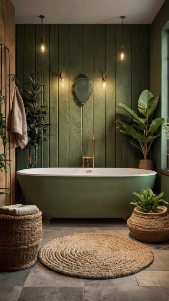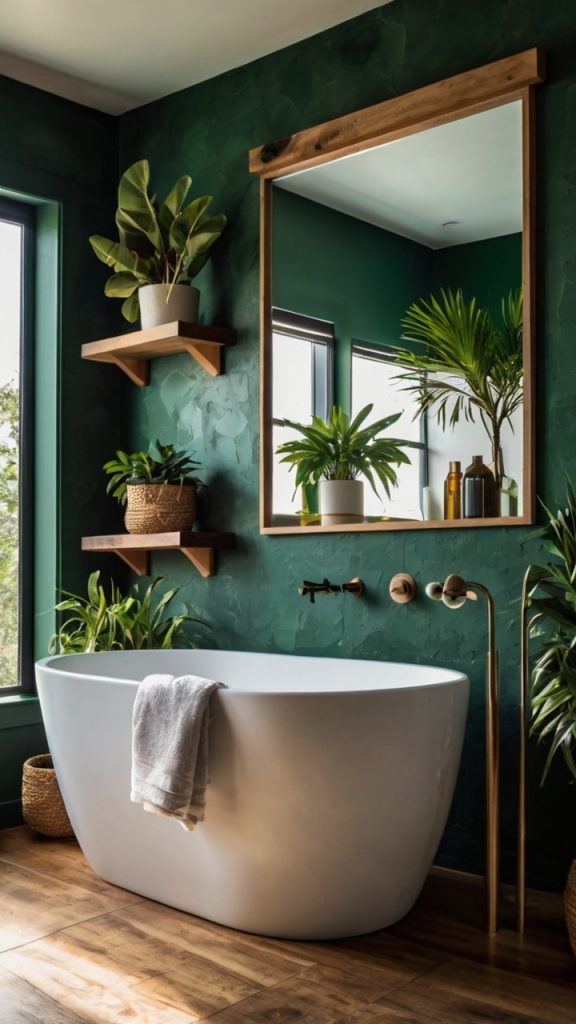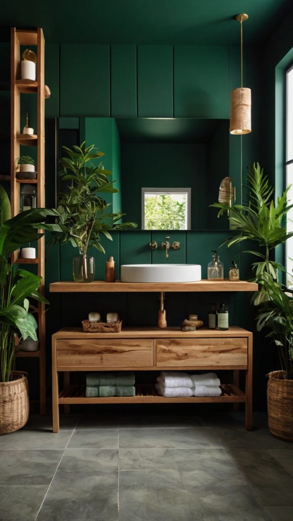 Going full nature-inspired with your dark green bathroom means embracing organic shapes, natural materials, and earthy vibes. Think less “hotel bathroom” and more “luxury treehouse spa.”