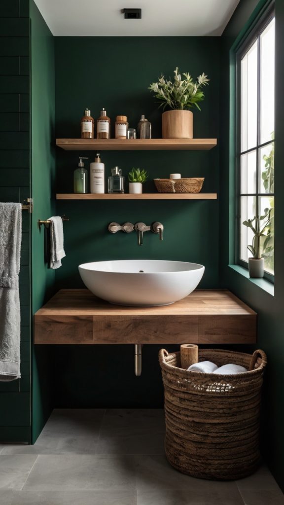This combination makes me ridiculously happy. Dark green and natural wood together create this perfect balance between sophisticated and earthy that just works every single time. It’s like bringing the forest indoors, but in a way that doesn’t make you feel like you’re showering in a tree house.