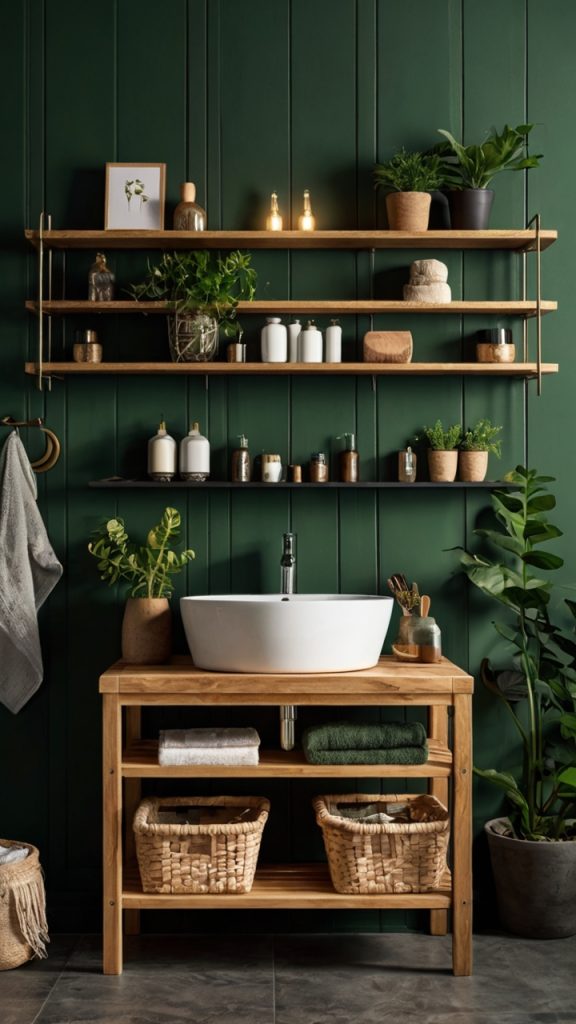 Open shelving in a dark green bathroom creates this perfect opportunity to display pretty things while maintaining functionality. It’s storage that doubles as decoration – efficiency at its finest.