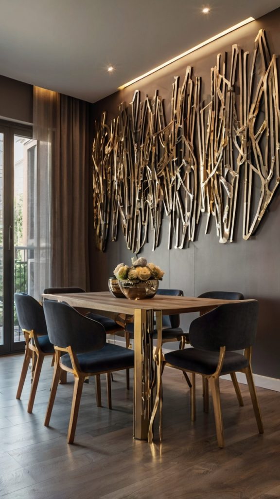Nothing says sophisticated quite like metallic wall sculptures that catch and reflect light throughout the day. They’re like jewelry for your walls, adding glamour without overwhelming the space.