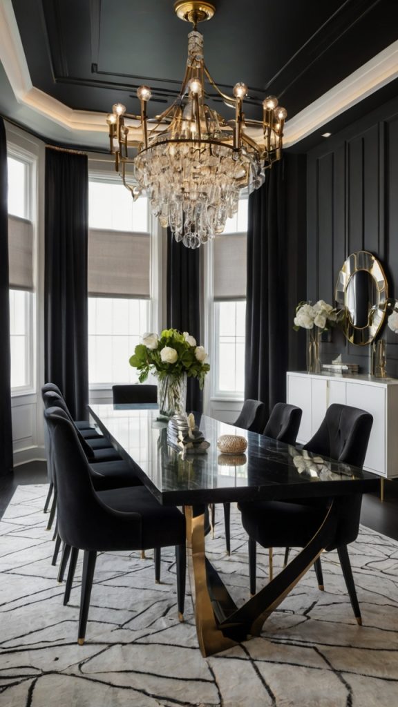When I helped redesign my brother’s dining room, we went full black and white, and the result was stunning. Black dining chairs against a white table, white walls with black trim, and a geometric black and white rug that tied everything together.