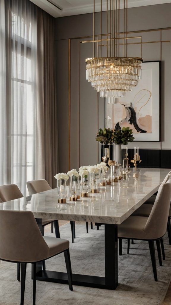 - Select one show-stopping dining table (marble or live-edge wood works brilliantly)