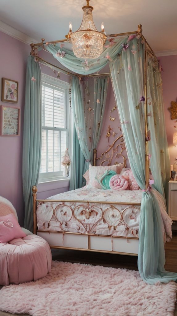 - A canopy bed or DIY tulle canopy hung from the ceiling