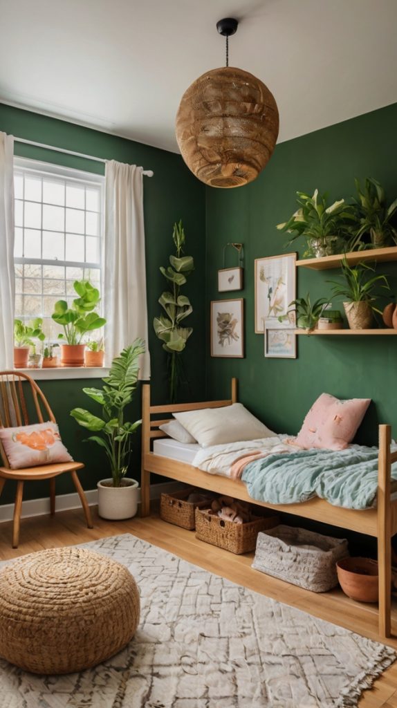 Pick your shade carefully though. Sage green and eucalyptus work as neutrals and won’t overwhelm the space. Forest green makes a bold statement but needs plenty of white or natural wood to balance it out. Mint green feels fresh and young without being babyish. I painted my daughter’s room sage green two years ago, and she still loves it – miracle!