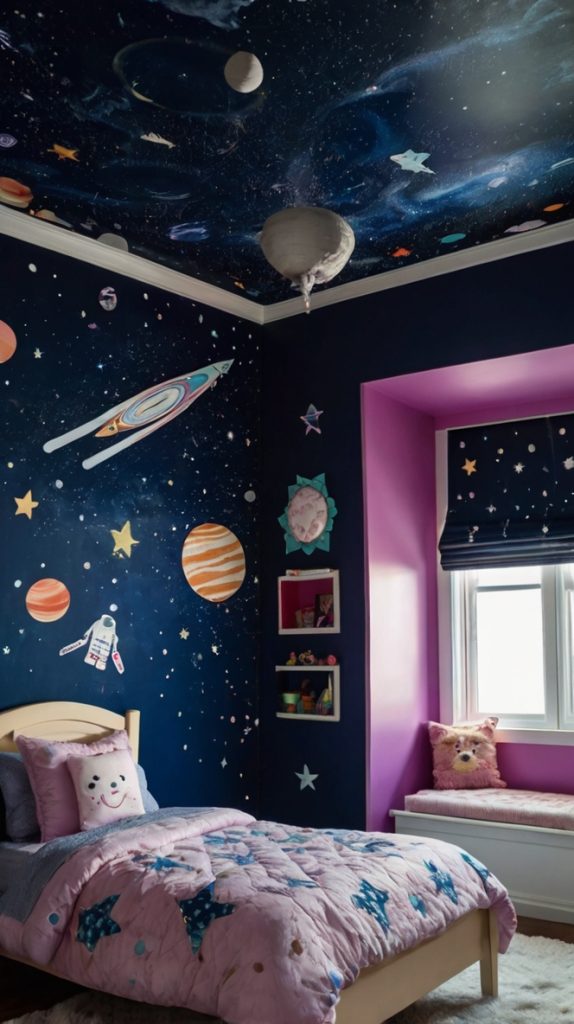 The ceiling becomes your canvas with this theme. Dark navy or black paint on the ceiling might sound scary, but trust the process. Add glow-in-the-dark paint for constellations, hang planet models, or invest in a star projector that actually shows accurate night skies. Science and decor combined? Yes, please!