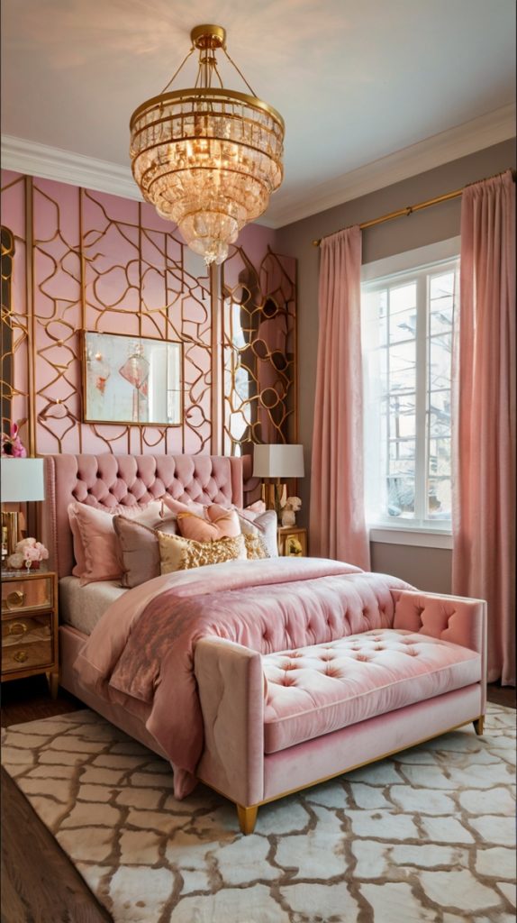 Start with your pink palette, but here’s the key – use multiple shades of pink. Blush, rose, coral, and mauve playing together creates depth instead of that flat Barbie-house look. Gold accents should be strategic, not everywhere. Think picture frames, drawer pulls, lamp bases, and maybe one statement mirror.